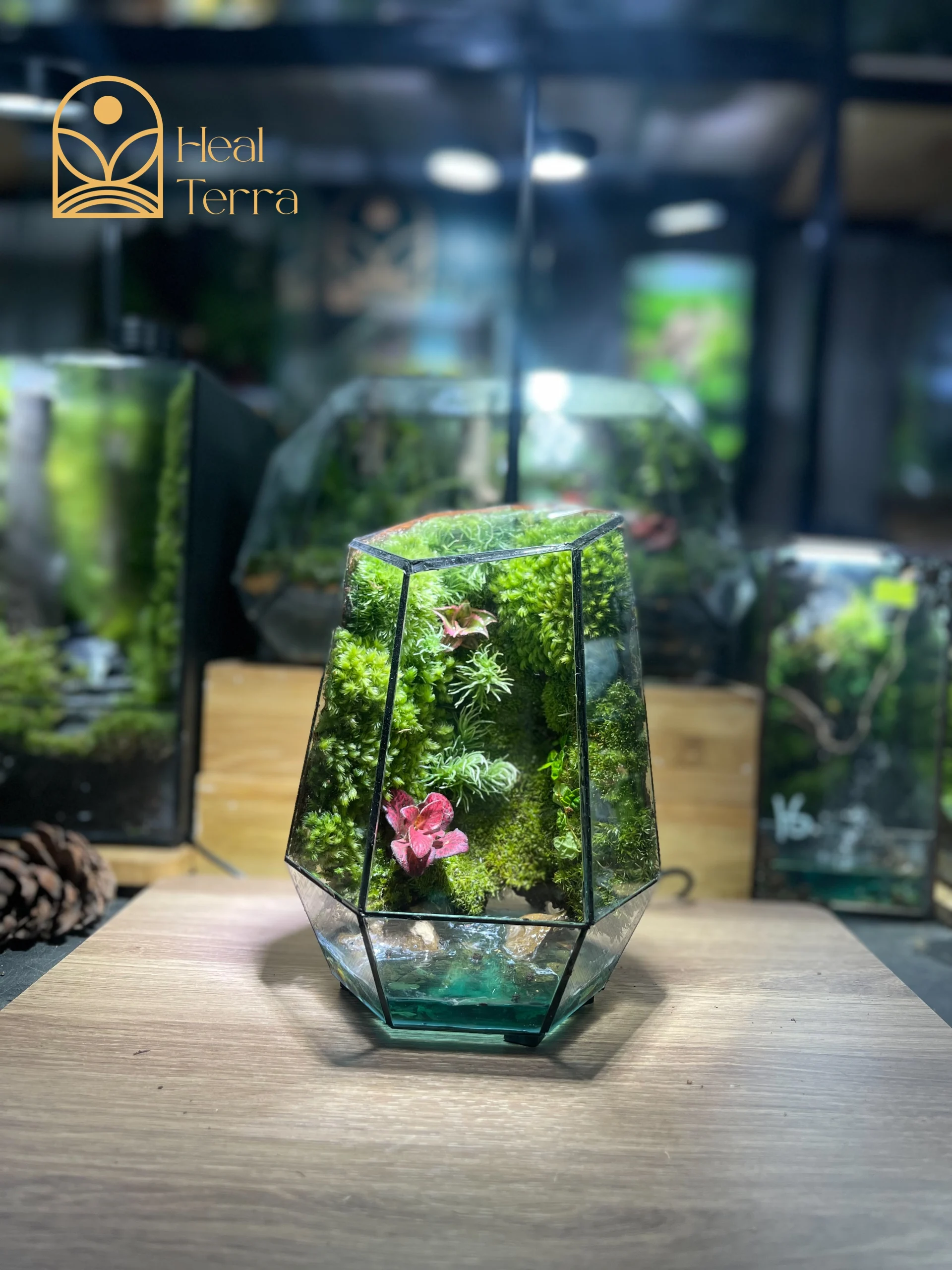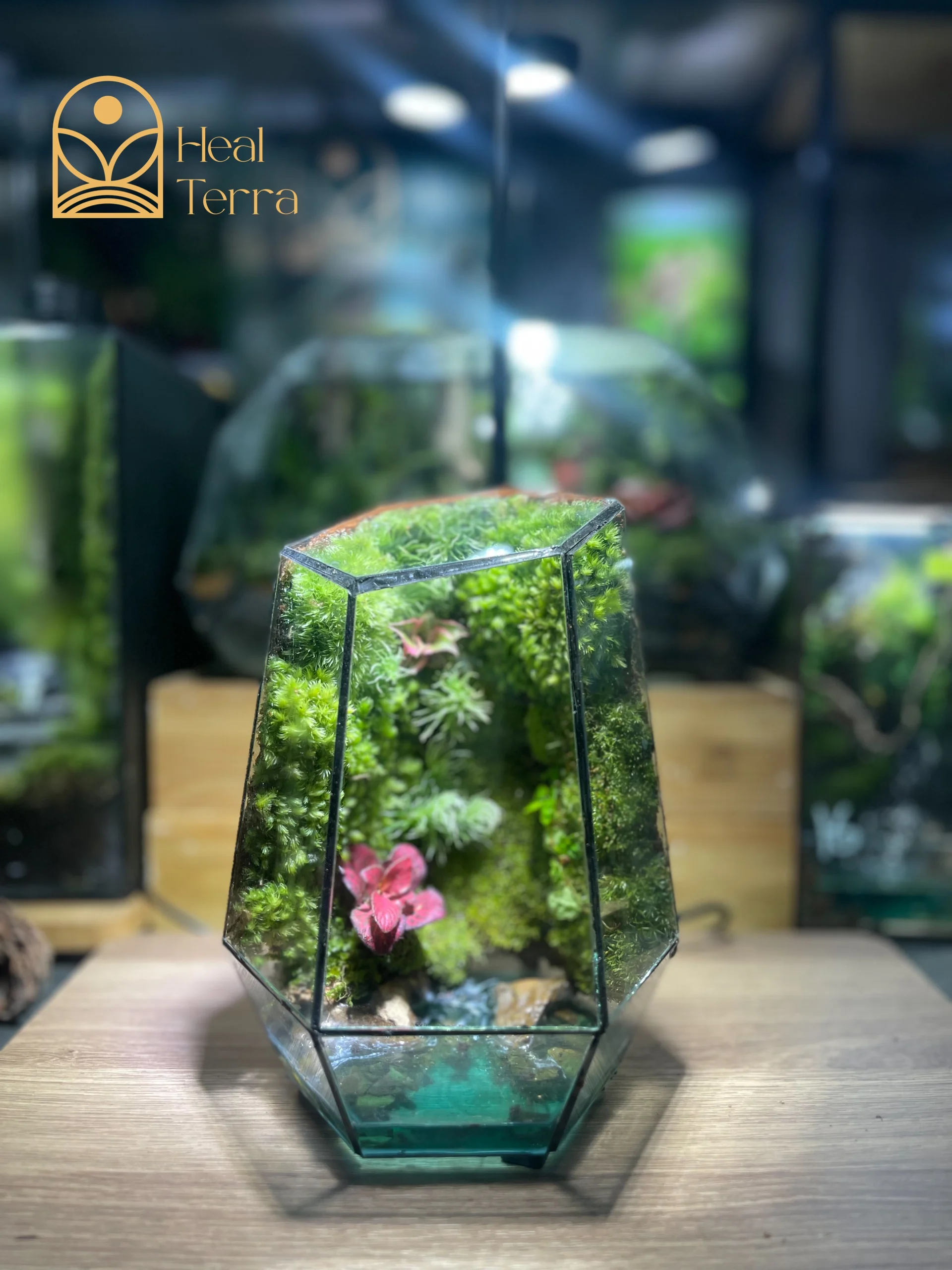 Sản phẩm này không mở ra như một khu rừng thênh thang, mà nó khép lại – gọn gàng, tinh tế, như một viên đá quý được cắt gọt tỉ mỉ. Toàn bộ hệ sinh thái bên trong, từ lớp nền đá suối đến những mảng rêu mướt, được bao bọc bởi lớp kính đa giác (geometric terrarium). Thiết kế này tạo nên hiệu ứng phản chiếu ánh sáng cực kỳ độc đáo, khiến “Ngọc Ẩn Lưu Ly” lung linh như đang tan chảy trong một khối lưu ly trong suốt.